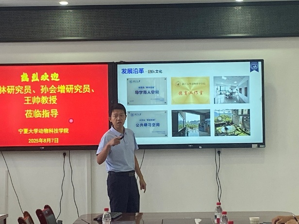会上,王帅教授分享了其团队在蠕虫对宿主肠道微生态及免疫调控模式方面的研究进展;孙会增研究员系统介绍了浙江大学奶业科学研究所的发展历程、研究方向与团队构成,并重点阐述了在粗饲料增效、乳品质量提升、新型饲用酶与微生物制剂创制应用及功能性乳酸菌开发等领域的研究成果;唐中林研究员则围绕家畜重要经济性状的遗传密码解析展开分享,为参会人员带来了启发。随后,马云教授详细介绍了宁夏大学动物科技学院的学科布局、科研团队及特色研究方向。
