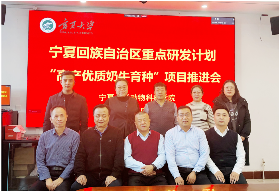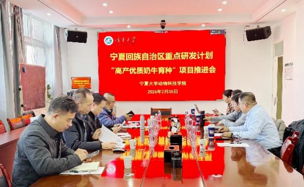 2026年2月5日下午,宁夏回族自治区重点研发计划“高产优质奶牛育种”项目推进会在宁夏大学文萃校区动物科技学院102会议室召开。中国农业科学院北京畜牧兽医研究所朱化彬研究员、宁夏兽药与饲料监察所所长杨奇研究员、宁夏回族自治区畜牧工作站温万研究员组成项目咨询专家组,对项目进展和进度安排进行质询,宁夏大学动物科技学院王兴平教授、淡新刚教授、胡亚美讲师、母童博士后;宁夏农垦乳业股份有限公司郝峰总畜牧师、韩丽云主管;宁夏反刍种性研究科技有限公司尹文总经理、贾保京繁育经理;内蒙古赛科星繁育生物技术(集团)股份有限公司丁瑞主任、中国农业大学张海亮博士后等项目组成员参加了会议。会议由项目负责人、宁夏大学动物科技学院副院长(主持工作)马云教授主持。